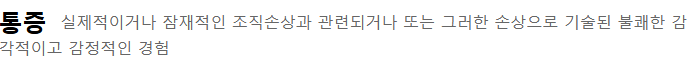 실제적이거나 잠재적인 조직손상과 관련되거나, 그러한 손상으로 기술된, 불쾌한 감각+감정적인 경험 이라고 설명되어 있습니다.